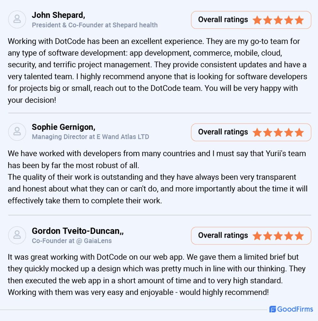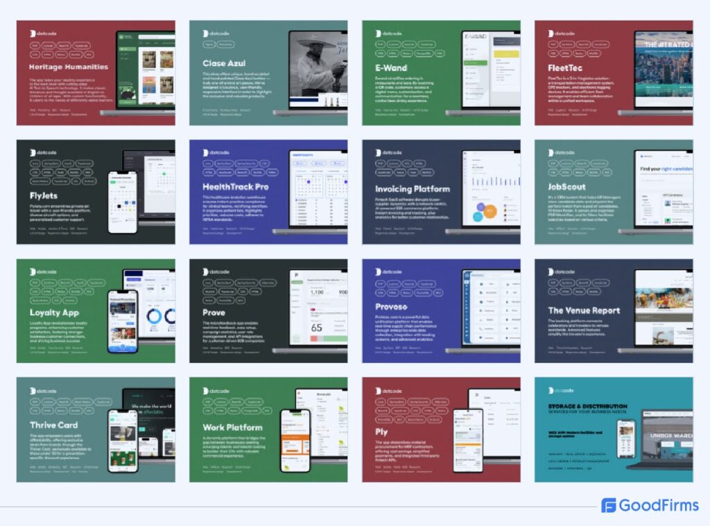 GoodFirms highlights that our company is extremely experienced in streamlining workflows, scalable architecture, data security & compliance, intuitive user experience, legacy system modernization and seamless integration with other systems. dotcode has been working with clients from leading industries such as Healthcare, Food Service, Travel & Hospitality, Fintech and EdTech.